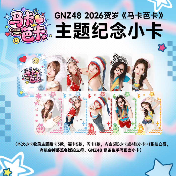 本次小卡收录主题藏卡3款,福卡5款,闪卡1款,内含5张小卡或4张小卡+1张拍立得,有机会掉落签名版拍立得、GNZ48 预备生手写留言小卡