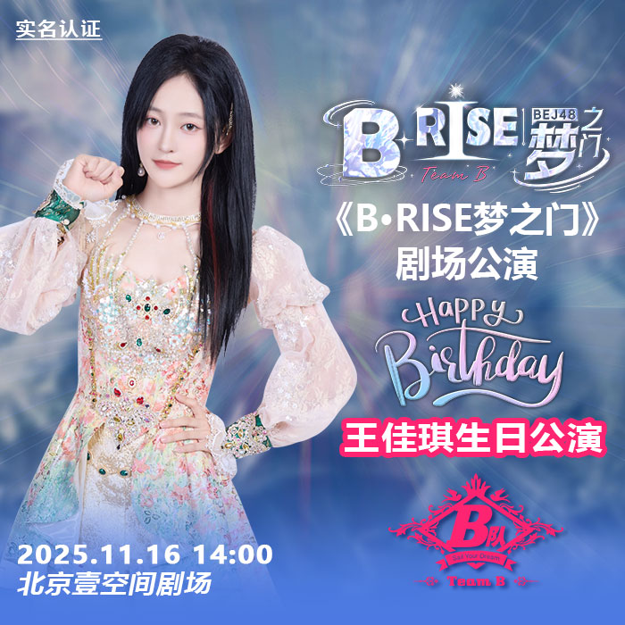 11月16日BEJ48 TEAM B剧场公演时间为14:00,《B·RISE梦之门》剧场公演 王佳琪生日公演 实名认证检票 本场公演将进行网络直播。本场支持门票退票退款服务规则。