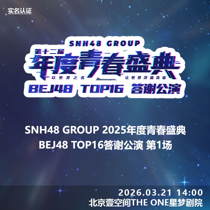3月21日BEJ48联合剧场公演时间为14:00,SNH48 GROUP 2025年度青春盛典 BEJ48 TOP16答谢公演第1场 实名认证检票 本场公演将进行网络直播。本场支持门票退票退款服务规则。