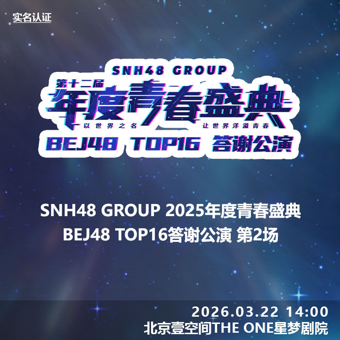 3月22日BEJ48联合剧场公演时间为14:00,SNH48 GROUP 2025年度青春盛典 BEJ48 TOP16答谢公演第2场 实名认证检票 本场公演将进行网络直播。本场支持门票退票退款服务规则。