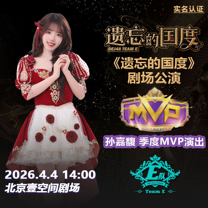 4月4日BEJ48 TEAM E剧场公演时间为14:00,《遗忘的国度》剧场公演 孙嘉馥季度MVP演出&新生亮相 实名认证检票 本场公演将进行网络直播。本场支持门票退票退款服务规则。