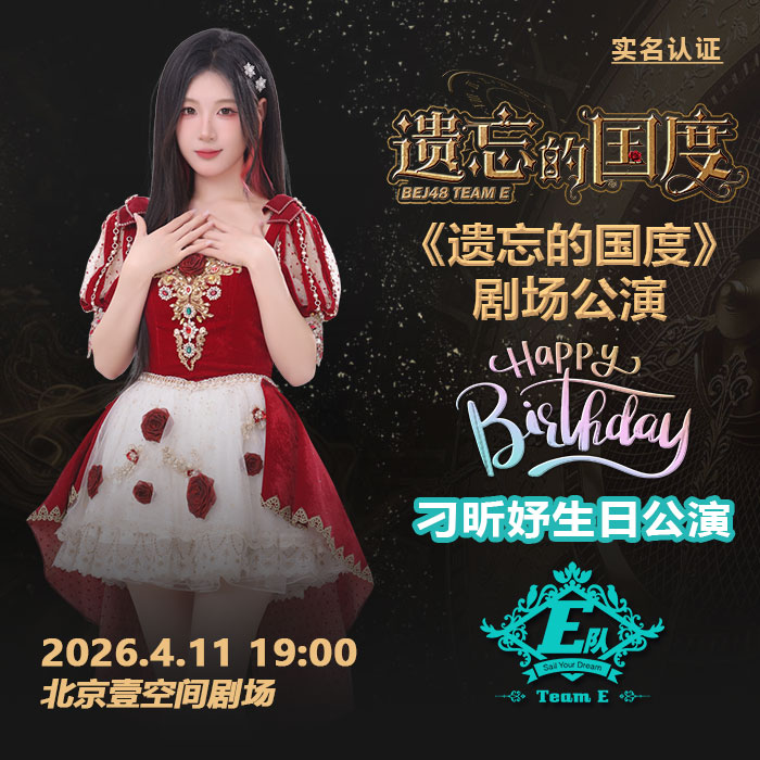 4月11日BEJ48 TEAM E剧场公演时间为19:00,《遗忘的国度》剧场公演 刁昕妤生日公演 实名认证检票 本场公演将进行网络直播。本场支持门票退票退款服务规则。