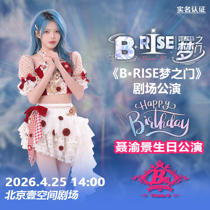 4月25日BEJ48 TEAM B剧场公演时间为14:00,《B·RISE梦之门》剧场公演 聂渝景生日公演 实名认证检票 本场公演将进行网络直播。本场支持门票退票退款服务规则。
